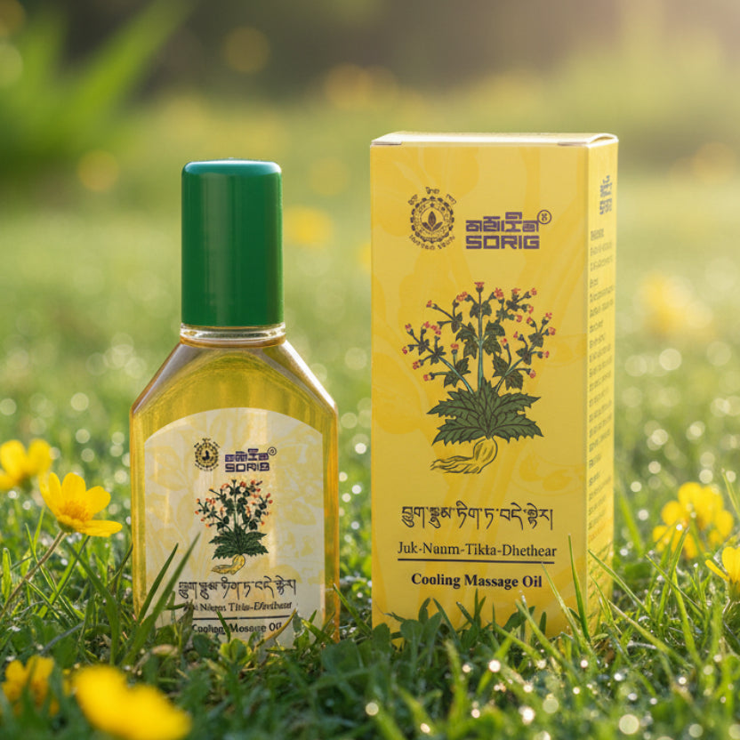 L'huile de massage rafraîchissante thérapeutique SORIG JUK-NUUM-TIKTA-DHETHEAR est préparée avec des herbes naturelles et plantes médicinales des montagnes de l'Himalaya pour pacifier les déséquilibres de l'énergie Lung, soulager les symptômes des troubles associés au sang et à la chaleur du corps (Tripa).