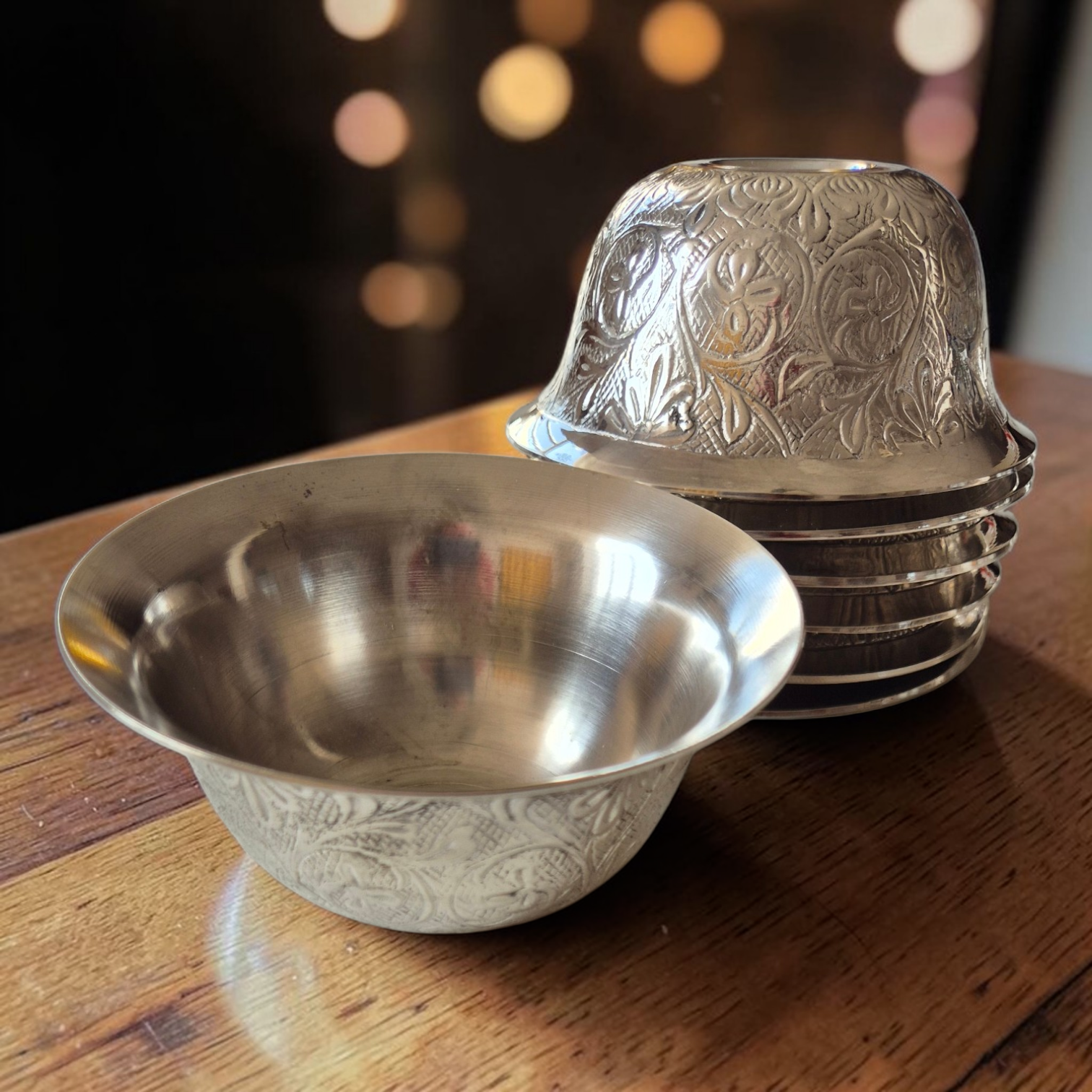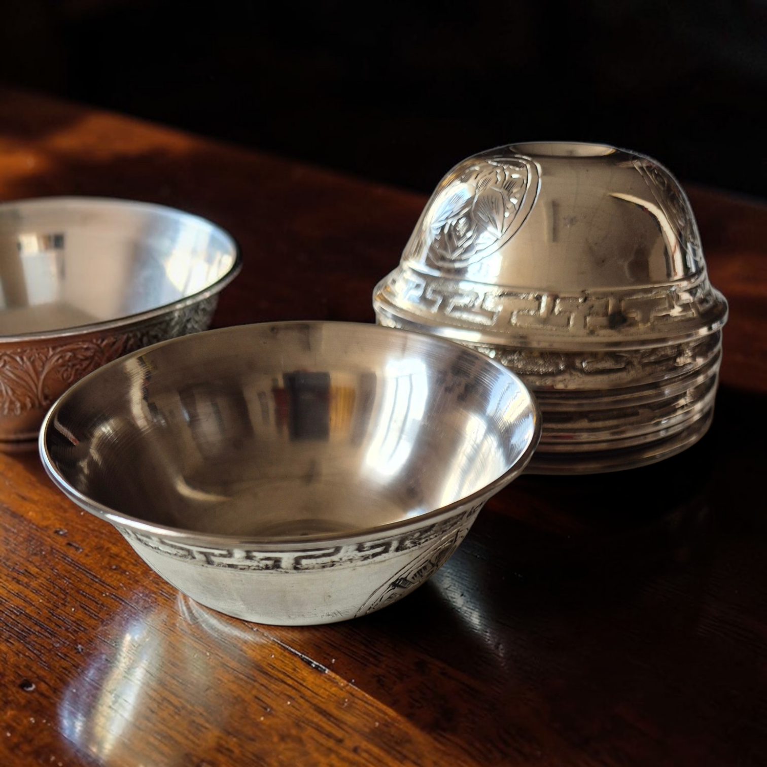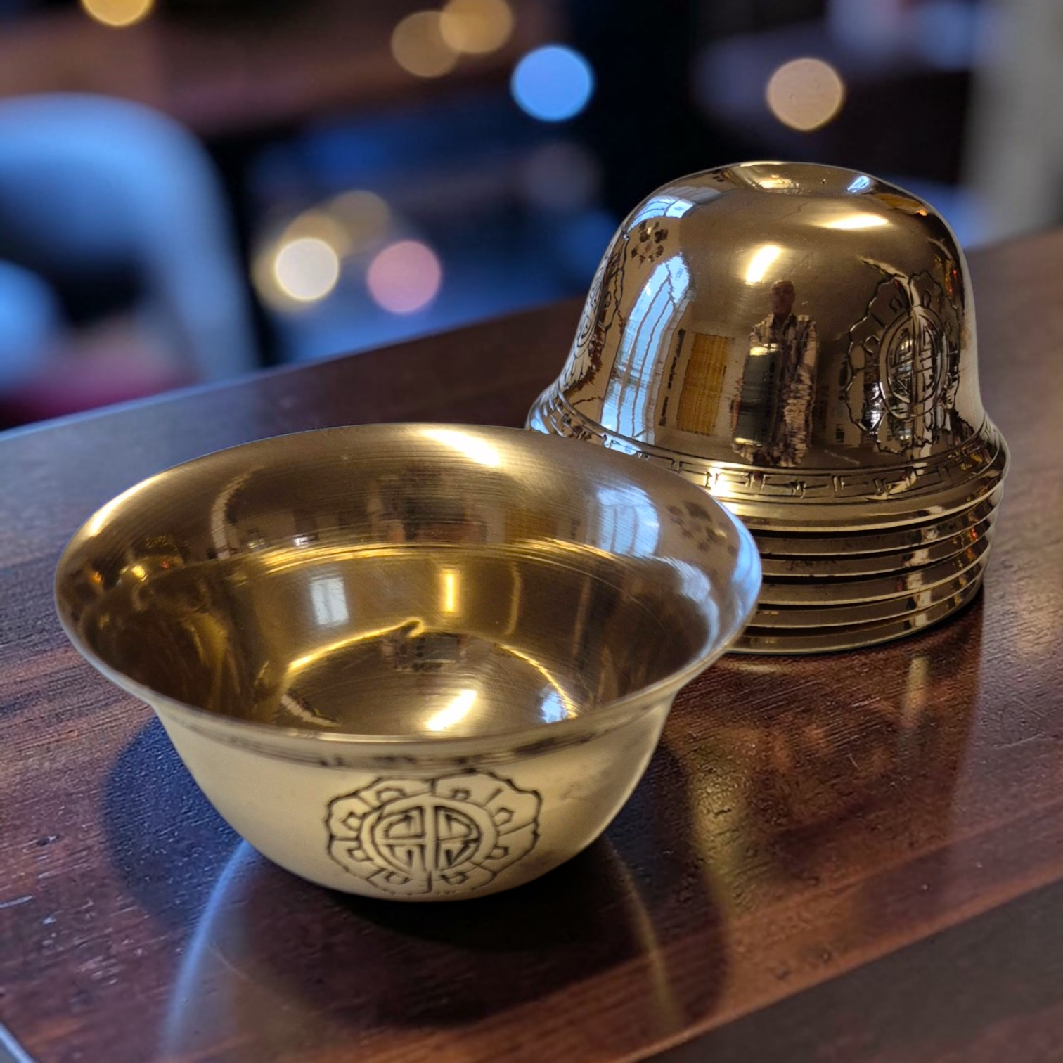Voici 7 bols à offrandes tibétains pour votre autel. Ces bols toujours au nombre de sept, sont destinés à recevoir l'eau présentée en offrande. Ils sont en argent massif ou en cuivre. Les bols remplis d'eau devront être changé chaque jour, tandis que le bol de riz pourra être changé uniquement à la pleine lune, par exemple. L'offrande est un geste d'humilité, de générosité et de confiance qui permet l'accumulation de mérites positifs.