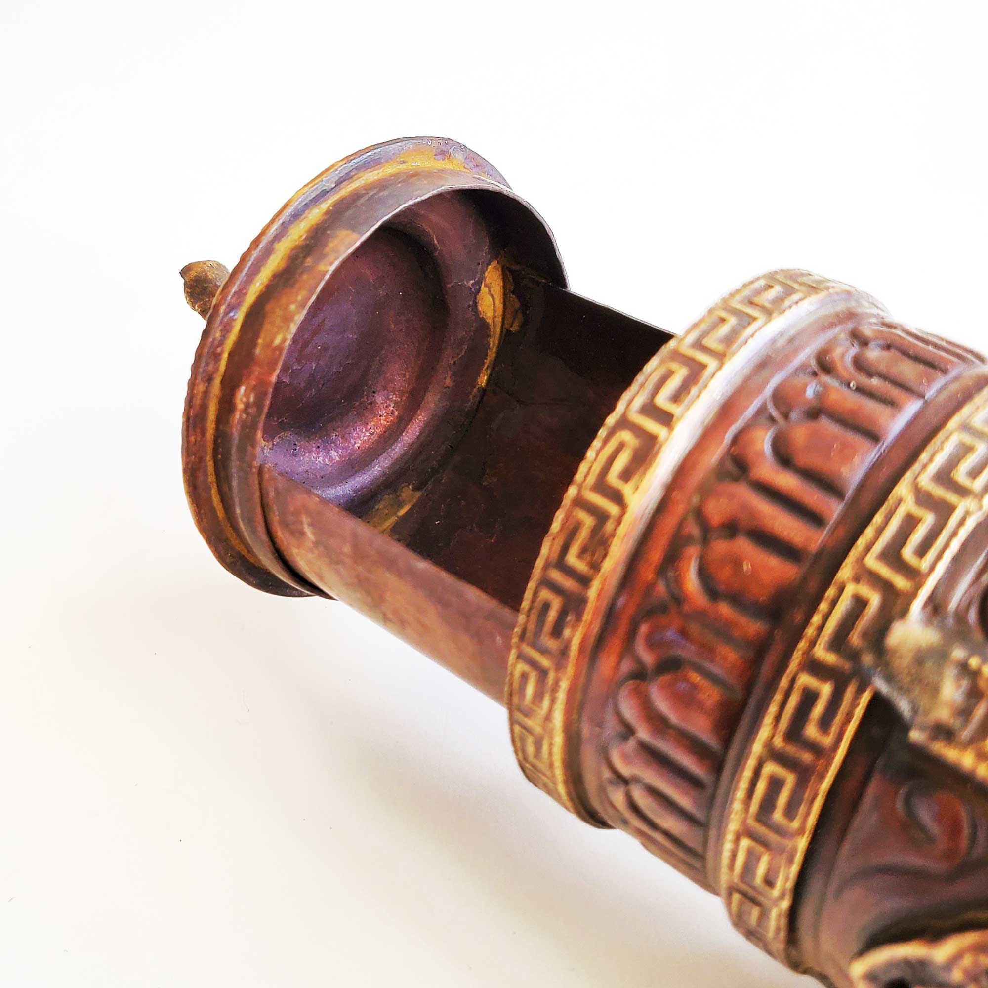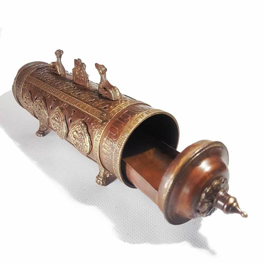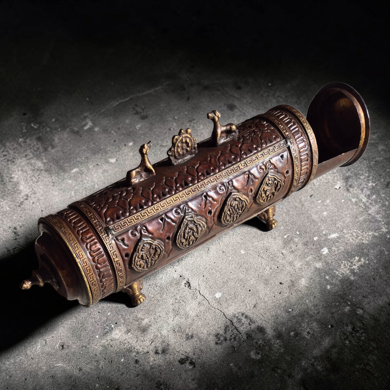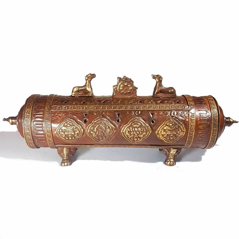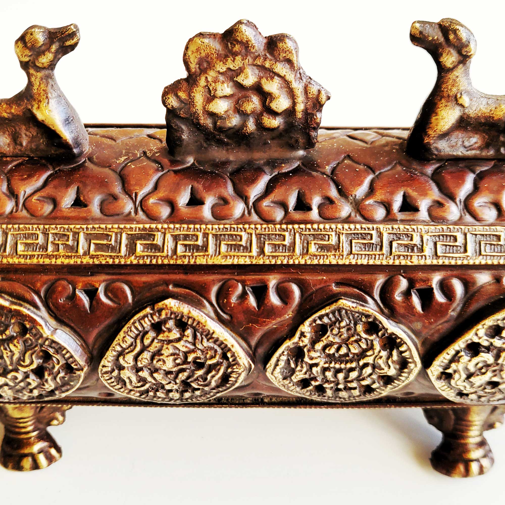 Brûleur d’encens tibétain fabriqué artisanalement en Inde. L'encens a pour fonction de purifier votre maison des énergies négatives environnantes mais aussi pour faire des offrandes aux Bouddhas pour obtenir leur protection et bénédictions. Ce modèle ancien 30cm d'un brûleur d'encens au Tibet avec la roue du Dharma est fait minutieusement de cuivre et d'autres métaux ornementés des 8 signes auspicieux que l'on nomme Tashi Targé.