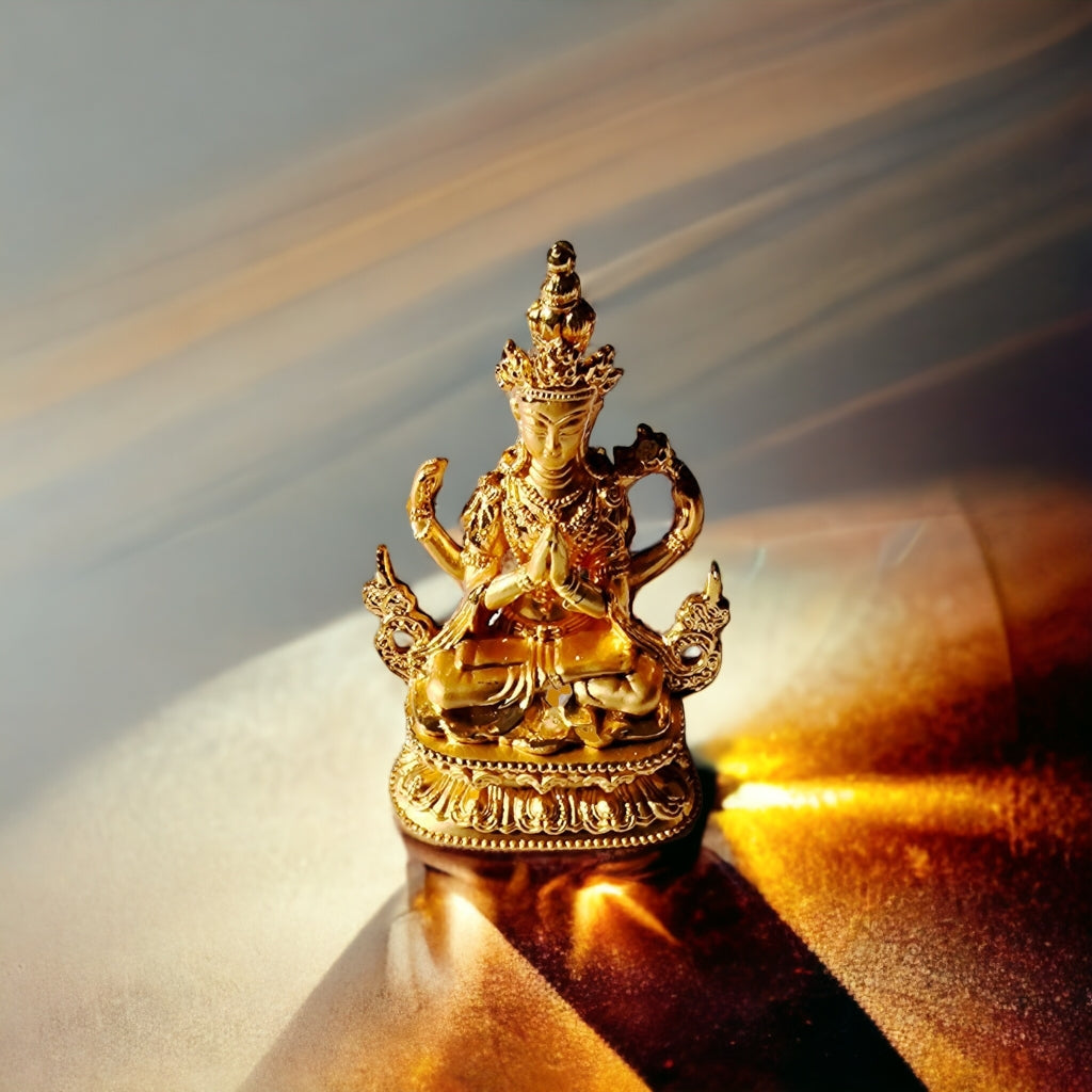 Ces statues dorées de 14cm ou de 8cm du Bouddha de la Compassion - en alliage de différents métaux - sont finement travaillées et décorées. L'insondable compassion qui émane du Bouddha Chenrézi répand des bienfaits sans limites sur tous les êtres dont la pure motivation fait appel à son énergie.