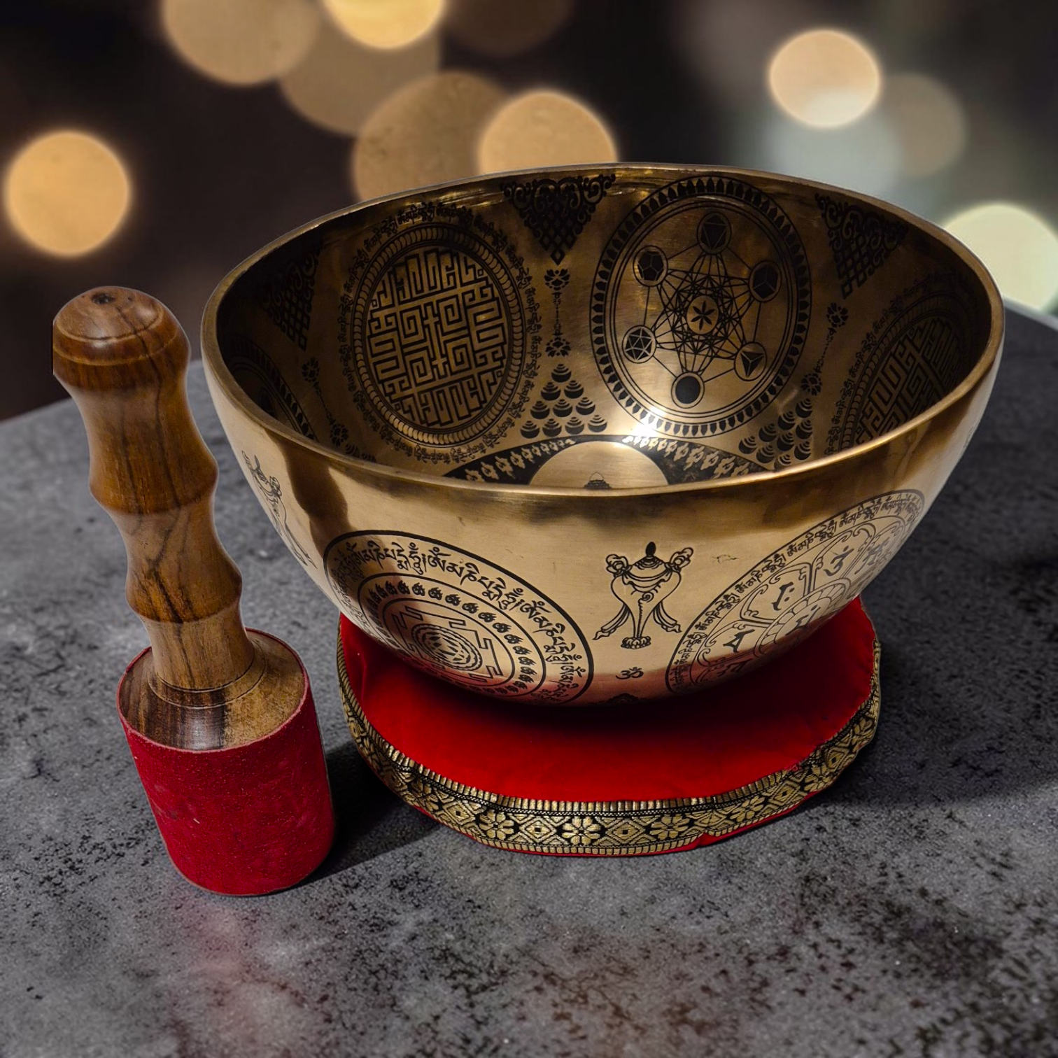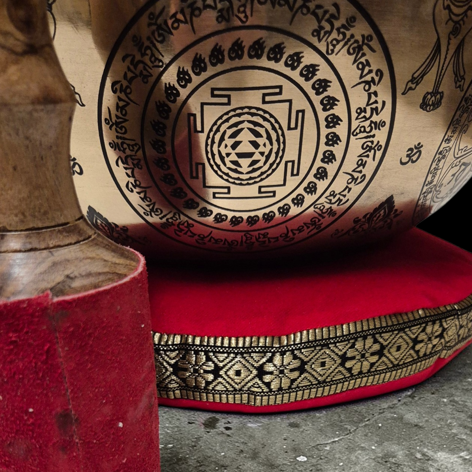 Ce bol BENGALI, gravé avec des images du Bouddha, du mantra de la compassion et de mandalas, estd'une exceptionnelle qualité et fabriqué à la main en Inde. Le son puissant produit par le bol permet une meilleure concentration de l'esprit afin d'encourager une bonne méditation. Le son est grave, profond, stable, long et dure longtemps. Ces bols viennent avec leur coussin et mailloche feutrée.