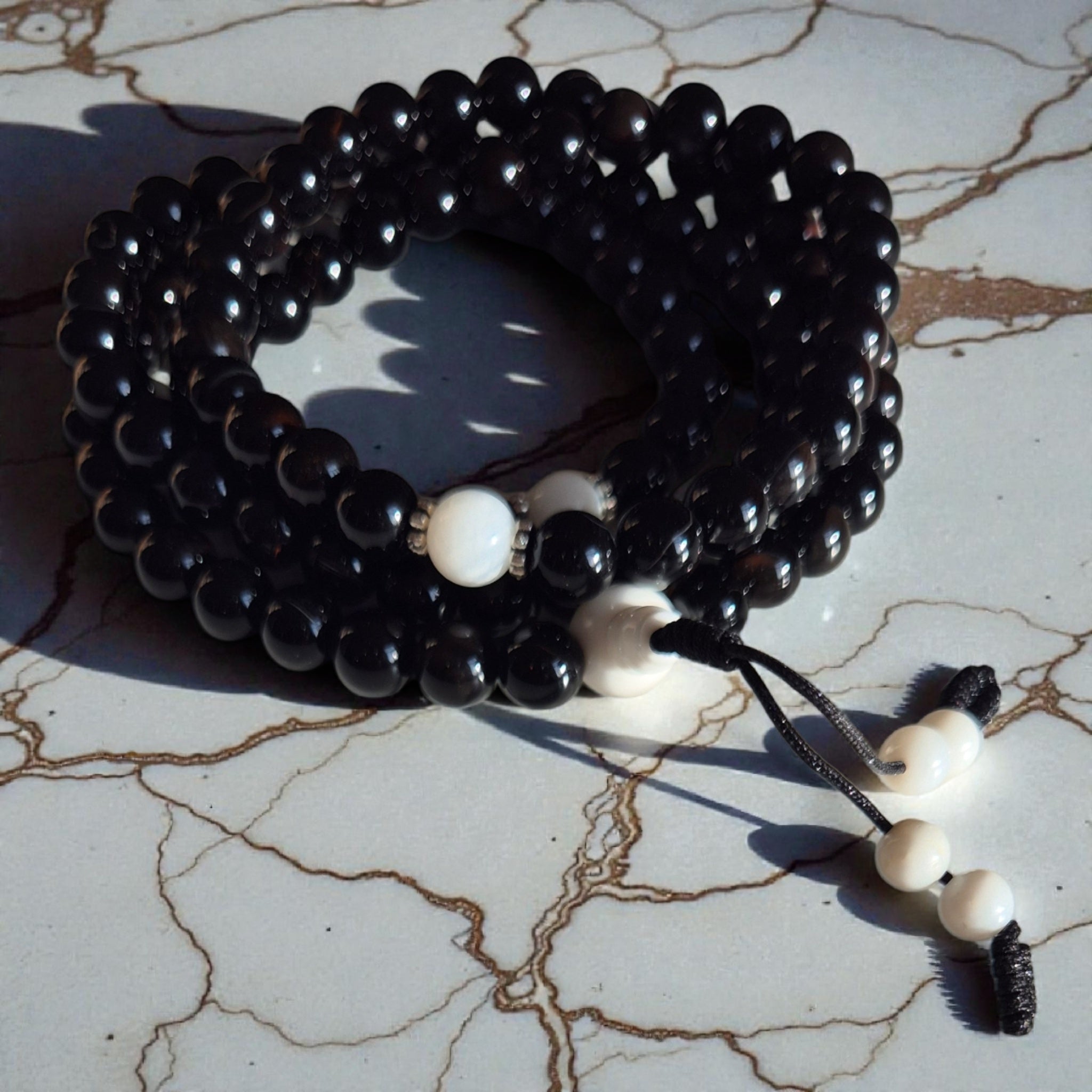 Sublimes malas 9mm (Circ. 75cm) en conque blanche avec des perles d'onyx noire ou la version en onyx noire avec des perles de conque blanche d'une grande qualité qui sont fabriqués au Népal par les artisans.