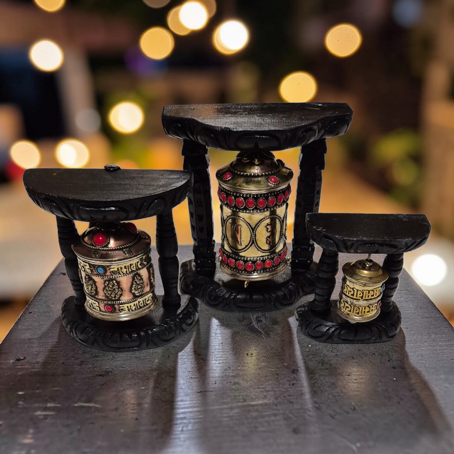 Dans la culture bouddhiste du Tibet, les moulins à prières sont très populaires pour assister les récitations de mantras et ainsi, la purification du négatif et l'accumulation du positif. Voici une belle collection de moulins tibétains avec support en bois pour accrocher au mur à la maison en trois tailles. Un rouleau de papier à l'intérieur comprend des milliers de mantra de la compassion Om Mani Padmé Houm. Ce moulin sur pied permet l'accumulation de l'énergie positive des mantras dans l'action du mouvement de faire tourner les moulins.